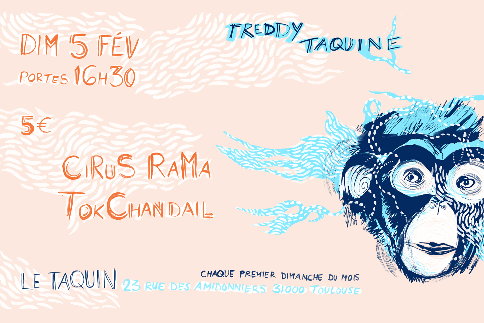 Freddy Taquine est un rendez-vous régulier à Toulouse à l’initiative des artistes du collectif Freddy Morezon et du Taquin, le 1er dimanche de chaque mois. Conçu comme un laboratoire, ce rendez-vous mensuel est l’occasion de concerts mais aussi d’expériences et de rencontres inédites, entre les musiciens, entre les musiques, entre les arts… C’est aussi l’occasion d’inviter des amis de collectifs pas si lointains, artistes-chercheurs, musiciens, bien sûr, mais aussi vidéastes, graphistes, plasticiens, danseurs… Mélanger les genres, les gens, et observer si la magie opère…